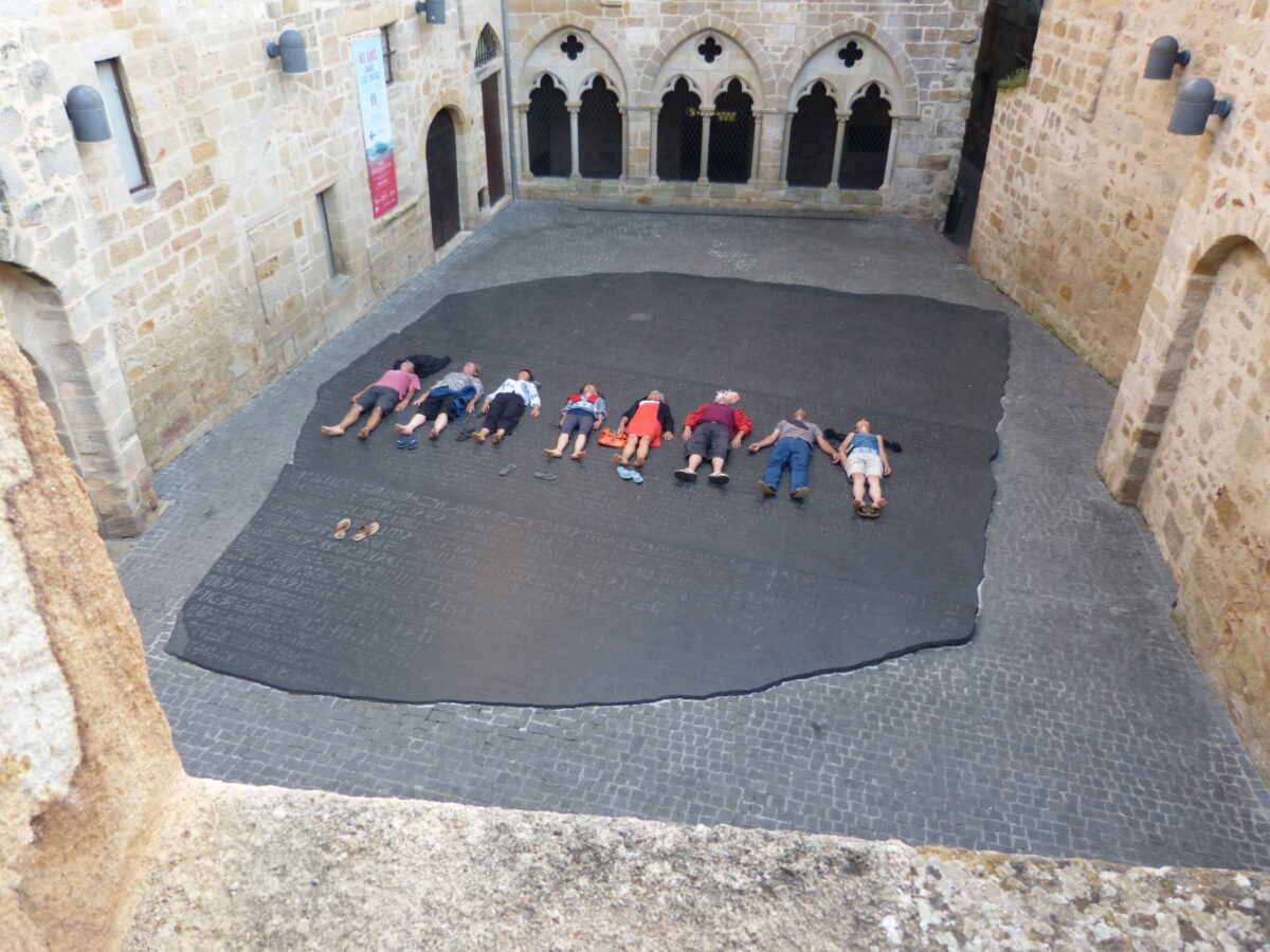 En randonnée sur les chemins de Compostelle, la pause « Feldenkraïs » nous a accompagnés comme ici sur la Pierre de Rosette à Figeac ! Relâchement, délassement, détente, décontraction, régénération, notre corps fatigué a adoré, c’était délicieux.